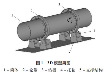 本文以某款谷物類烘干機為研究對象,烘干機一般包括干燥系統、上料系統、熱風爐系統、出料系統、引風系統、控制系統與安全系統。干燥系統是其最為關鍵的系統,主要組成部件為筒體、輪帶、墊板、托輪和支撐結構,其中筒體、墊板和輪帶都為設備運行過程中主要的受力部件,且易發生失效,而托輪和支撐結構所受為體積力,均布于整個結構系統,一般不會發生應力失效。